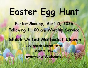 We are now part of the New River Cooperative Parish. We have joined with Cox’s Chapel UMC, Mt. Zion UMC,and Piney Creek UMC to form the New River Cooperative Parish. We have Pastor Ben Gatton and Pastor Tom Miller serving as our pastors. We welcome them and look forward to the exciting plans for our church as we work together to serve God and reach out to our community. Shiloh’s worship service time has changed to 11:00 am. Please check our website for other changes and updates.